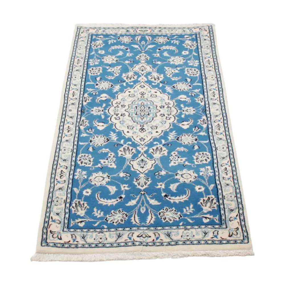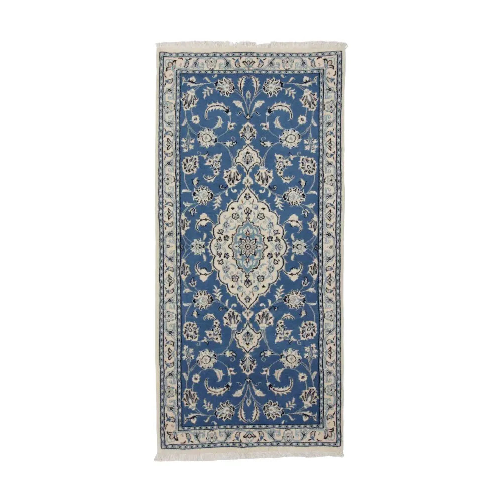 La ville de Nain est située dans la partie centrale de l'Iran, à proximité de la célèbre ville d'Ispahan, et est connue pour ses traditions artisanales depuis des siècles. Bien que l'histoire de la fabrication de tapis à Nain soit relativement récente, les habitants de la ville ont rapidement établi l'artisanat et affiné leurs techniques. À l'origine, la tradition du tissage était davantage axée sur la production de tissus et d'étoffes fines, mais le tissage de tapis a rapidement pris le dessus au milieu du XXe siècle. Les tapis de la ville de Nain sont devenus des symboles de qualité, d'élégance et de motifs sophistiqués. Les artisans locaux utilisent de la laine ou de la soie de haute qualité pour créer des tapis extrêmement complexes. Contrairement aux tapis fabriqués dans d'autres régions du pays, les tapis Nain présentent généralement des teintes plus claires, souvent dans les tons crème, beige et bleu clair. Le tissage de tapis est devenu un pilier de l'économie de la ville, et les tapis Nain sont devenus des symboles de la tradition du tissage de tapis persans dans le monde moderne.