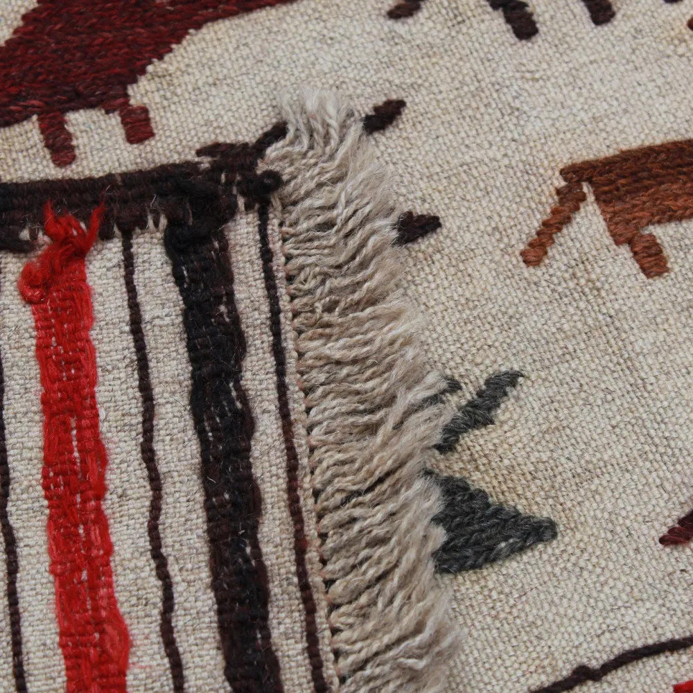 Le tapis nomade afghan kilim reflète l'héritage culturel de l'Afghanistan. Ces chefs-d'œuvre évoquent les traditions et l'art des tribus nomades. Avec leurs étonnants motifs antiques, ils constitueront une véritable pièce maîtresse dans votre maison, qu'ils soient étalés sur le sol ou accrochés au mur en tant que tapis mural. Chaque pièce du tapis tribal kilim tissé à la main est unique. Utilisé comme tapis mural, un tapis nomade kilim peut constituer un véritable élément de décoration sur n'importe quel mur de votre maison. Les motifs géométriques et animaliers contribuent à l'atmosphère unique et à la chaleur de votre maison. Le tapis nomade afghan raconte l'histoire du mode de vie des tribus et de leurs traditions. Un tapis mural nomade n'est pas seulement un objet décoratif, c'est aussi un objet artisanal précieux qui rapproche l'art et la culture tribale afghane de vous, directement à travers les murs de votre maison. Le tapis tribal kilim est fait de laine de haute qualité, ce qui garantit sa durabilité et sa facilité de nettoyage. Ce tapis nomade est le choix parfait si vous souhaitez créer une décoration intérieure unique et étonnante pour votre maison.