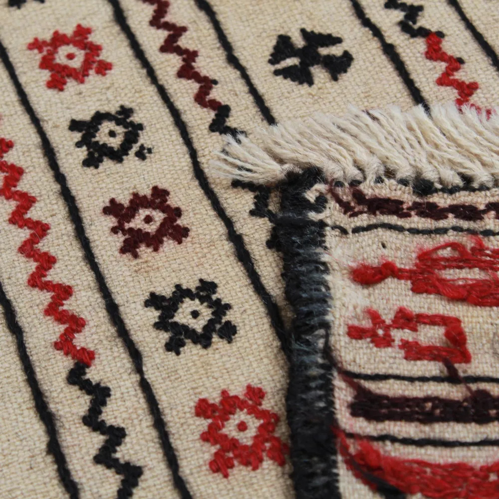 Le nettoyage d'un tapis tribal Kilim n'est pas une tâche difficile. Les petites taches peuvent être facilement éliminées à l'aide d'un chiffon légèrement humide ou d'un produit nettoyant pour tapis disponible dans le commerce et adapté au nettoyage de la laine. Cependant, si la tache est importante, nous vous recommandons de faire appel aux services d'une entreprise professionnelle de nettoyage de tapis. Le tapis Tribal Kilim doit être nettoyé avec l'aspirateur réglé sur le niveau le plus bas. Le tapis Tribal Kilim ne retient pas la poussière. La tradition séculaire veut que l'on suspende le tapis Kilim et qu'on le batte avec un bâton de dépoussiérage, mais cette pratique n'est en fait pas recommandée car elle risque d'endommager le tissage du Kilim. Faites attention aux mites même si vous utilisez votre kilim nomade comme tapis mural, car elles peuvent l'endommager.