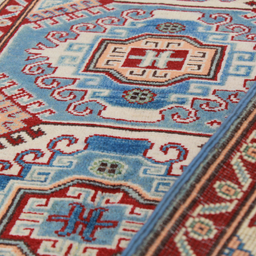 Le tapis Kazak est devenu populaire principalement en raison de ses couleurs chaudes et claires à la fois. Elle est le plus souvent recommandée par les architectes d'intérieur pour les maisons à la décoration classique. Ses motifs sont inspirés des motifs géométriques russes. On l'appelle tapis Kazak, mais c'est un tapis afghan. La laine utilisée est colorée avec des teintures végétales naturelles. Le Tapis Oriental Kazak se caractérise par une forte palette de couleurs. Son avantage est que, grâce à ses couleurs vives, il n'assombrit pas l'atmosphère de votre pièce. En tant que tapis de salon, il se marie parfaitement avec les couleurs des canapés ou des tables basses. En tant que tapis de chambre à coucher, il est également utilisé sur les deux côtés du lit. Dans ce cas, il suffit que les couleurs des tapis soient assorties. Chaque étape de la fabrication du tapis est faite à 100 % à la main. Grâce à sa durabilité, il peut être posé dans les salons les plus fréquentés. La technique de nouage des tapis Oriental Kazak est appelée Gheordes, ce qui signifie double nouage. Une fois le tapis terminé, il est lavé quatre fois, puis laissé à sécher au soleil. Il ne contient aucune substance allergène.