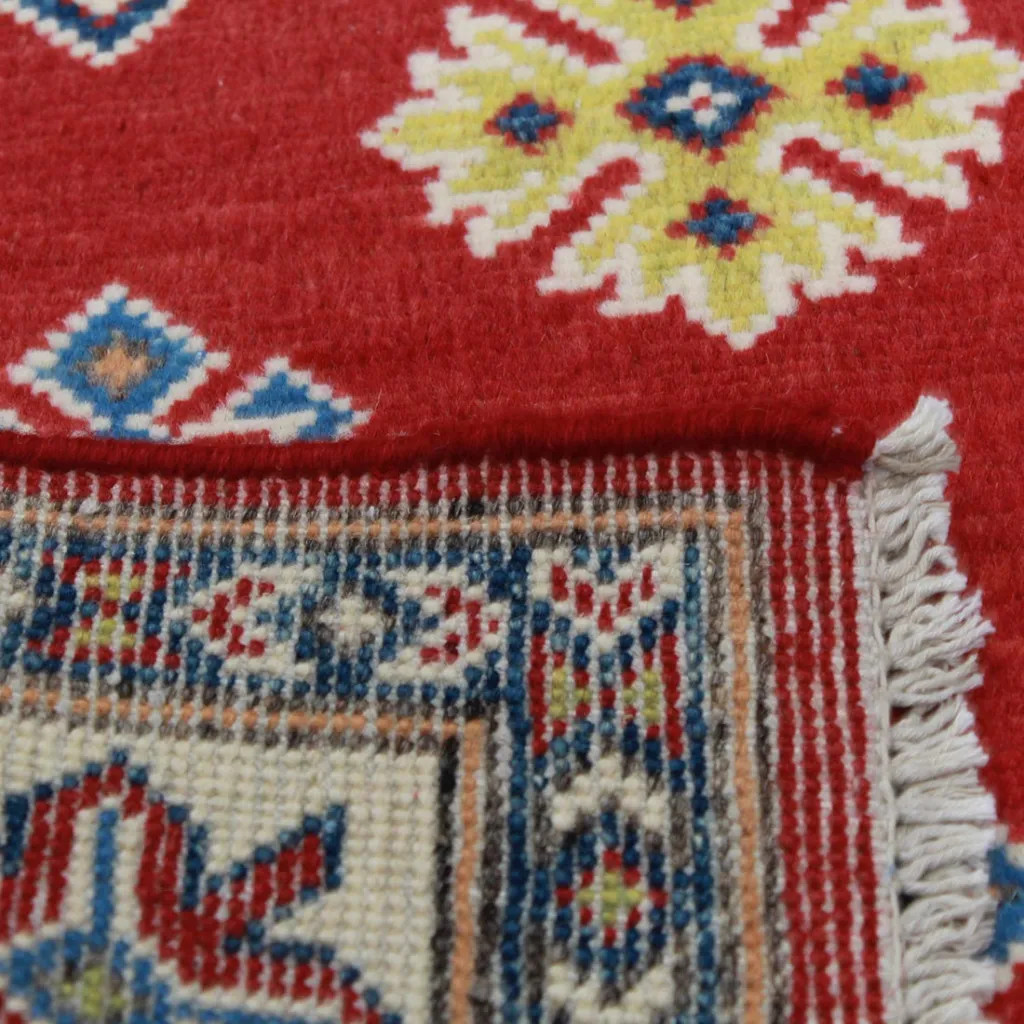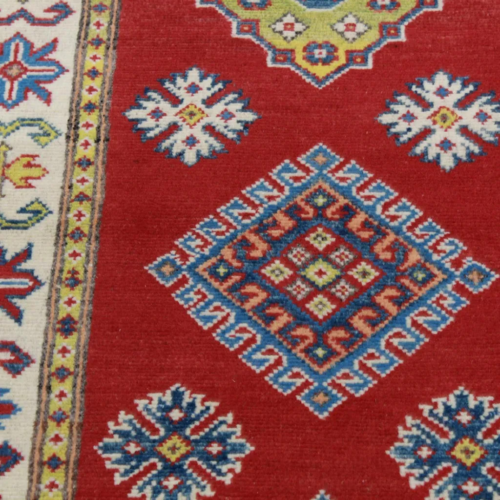 Vous êtes à la recherche d'un tapis Oriental coloré ? Alors jetez un coup d'œil à ce tapis Kazak, qui vous captivera avec ses belles couleurs ludiques. Ce tapis Kazak est durable, facile à nettoyer et à aspirer. Il convient mieux aux pièces dont l'intérieur est classique. Comme c'est un tapis Oriental multicolore, il est facile d'assortir les couleurs des meubles ou d'autres textiles. Ce tapis Kazak est lavé quatre fois et séché au soleil. Il ne contient aucune substance allergène. Il peut également être utilisé dans les pièces équipées d'un chauffage par le sol, mais dans ce cas, il est conseillé de passer l'aspirateur sous le tapis, pour éviter les mites. Les couleurs du tapis Kazak sont dérivées de plantes présentes dans la nature. Le tapis Kazak est principalement fait en Afghanistan ou dans les régions du Pakistan peuplées d'Afghans. Comme il s'agit d'un tapis durable, il peut être utilisé dans les salles de séjour les plus fréquentées. Il ajoute de l'élégance et du prestige à votre salon. Le tapis Kazak est fait à 100 % de laine afghane. Il se caractérise principalement par des motifs géométriques. Il s'agit d'un tapis noué à la main de très grande qualité.