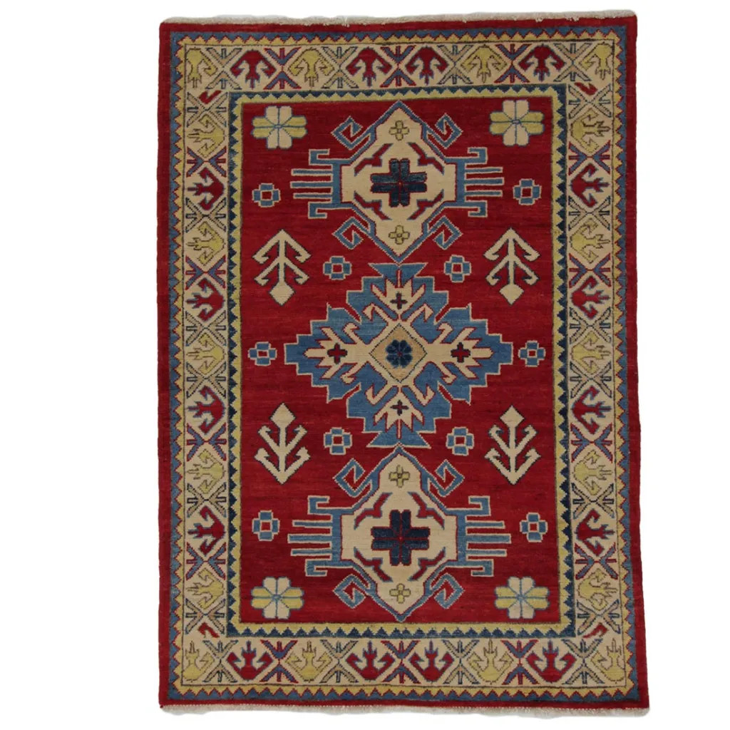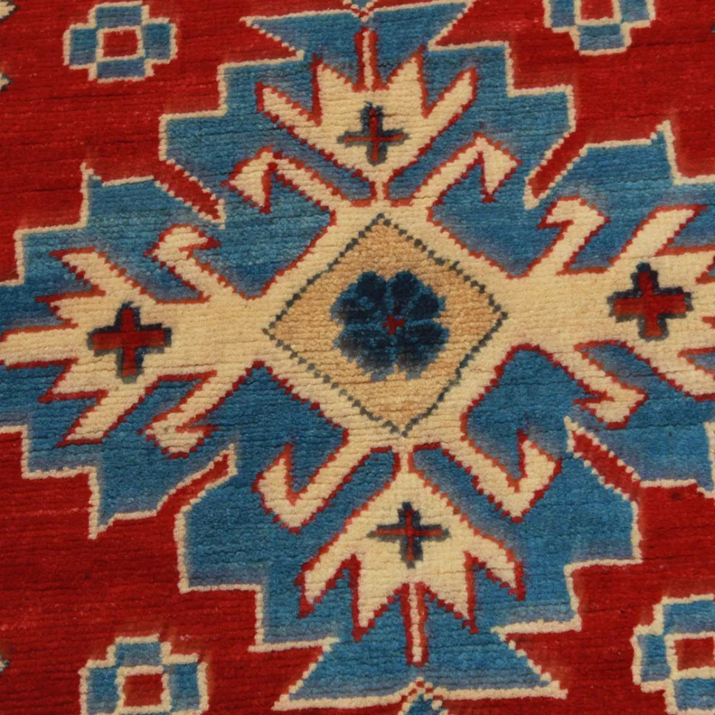 Vous êtes à la recherche d'un tapis Oriental coloré ? Alors jetez un coup d'œil à ce tapis Kazak, qui vous captivera avec ses belles couleurs ludiques. Ce tapis Kazak est durable, facile à nettoyer et à aspirer. Il convient mieux aux pièces dont l'intérieur est classique. Comme c'est un tapis Oriental multicolore, il est facile d'assortir les couleurs des meubles ou d'autres textiles. Ce tapis Kazak est lavé quatre fois et séché au soleil. Il ne contient aucune substance allergène. Il peut également être utilisé dans les pièces équipées d'un chauffage par le sol, mais dans ce cas, il est conseillé de passer l'aspirateur sous le tapis, pour éviter les mites. Les couleurs du tapis Kazak sont dérivées de plantes présentes dans la nature. Le tapis Kazak est principalement fait en Afghanistan ou dans les régions du Pakistan peuplées d'Afghans. Comme il s'agit d'un tapis durable, il peut être utilisé dans les salles de séjour les plus fréquentées. Il ajoute de l'élégance et du prestige à votre salon. Le tapis Kazak est fait à 100 % de laine afghane. Il se caractérise principalement par des motifs géométriques. Il s'agit d'un tapis noué à la main de très grande qualité.