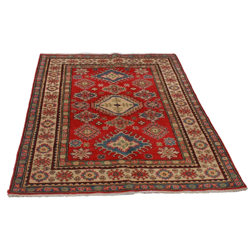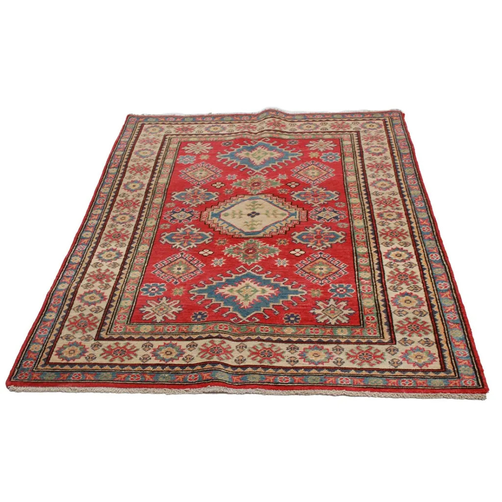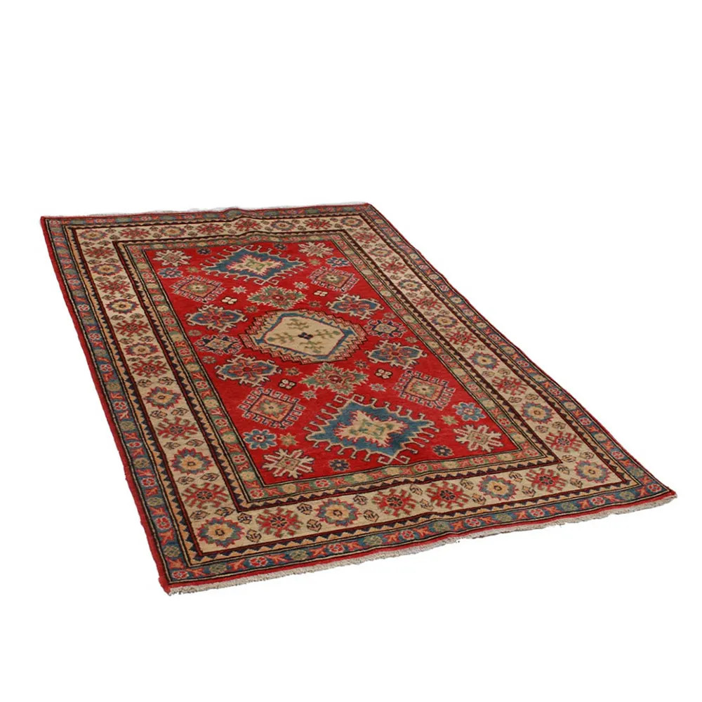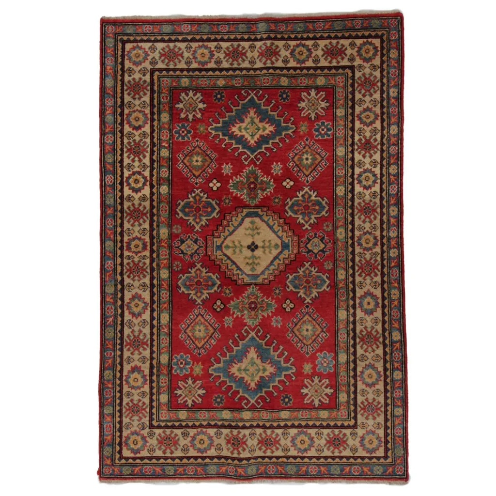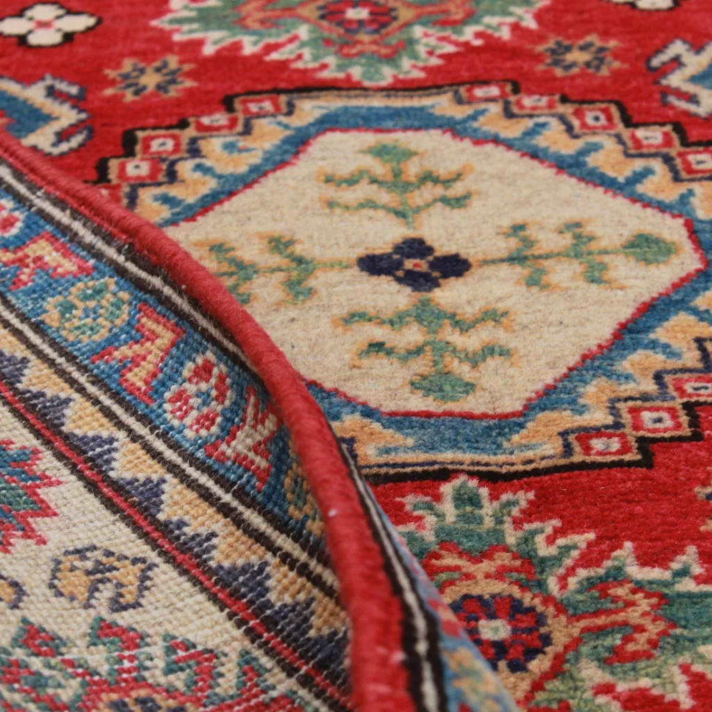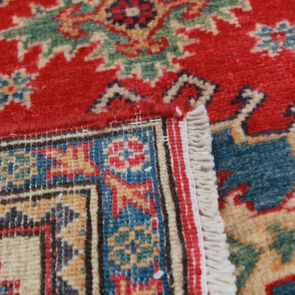 Vous êtes à la recherche d'un tapis Oriental coloré ? Alors jetez un coup d'œil à ce tapis Kazak, qui vous captivera avec ses belles couleurs ludiques. Ce tapis Kazak est durable, facile à nettoyer et à aspirer. Il convient mieux aux pièces dont l'intérieur est classique. Comme c'est un tapis Oriental multicolore, il est facile d'assortir les couleurs des meubles ou d'autres textiles. Ce tapis Kazak est lavé quatre fois et séché au soleil. Il ne contient aucune substance allergène. Il peut également être utilisé dans les pièces équipées d'un chauffage par le sol, mais dans ce cas, il est conseillé de passer l'aspirateur sous le tapis, pour éviter les mites. Les couleurs du tapis Kazak sont dérivées de plantes présentes dans la nature. Le tapis Kazak est principalement fait en Afghanistan ou dans les régions du Pakistan peuplées d'Afghans. Comme il s'agit d'un tapis durable, il peut être utilisé dans les salles de séjour les plus fréquentées. Il ajoute de l'élégance et du prestige à votre salon. Le tapis Kazak est fait à 100 % de laine afghane. Il se caractérise principalement par des motifs géométriques. Il s'agit d'un tapis noué à la main de très grande qualité.