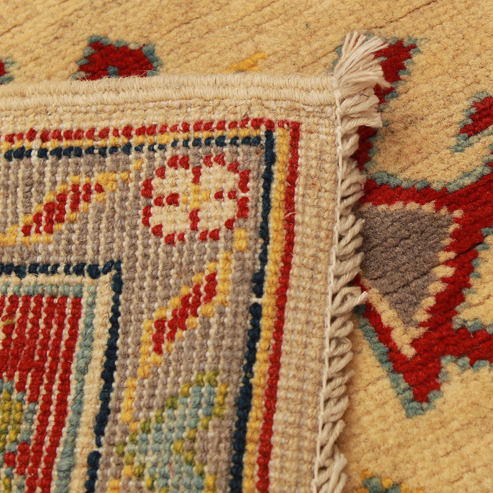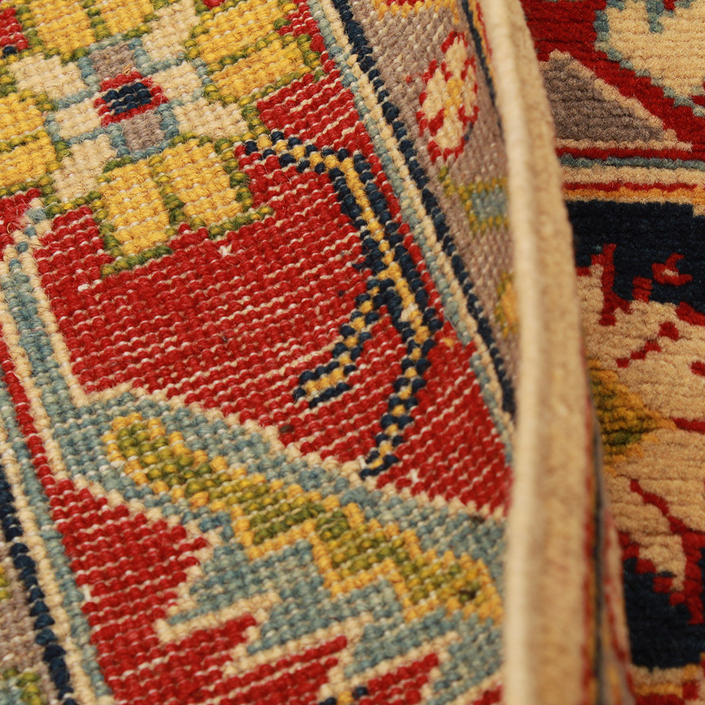 Le tapis Kazak est devenu populaire principalement en raison de ses couleurs chaudes et claires à la fois. Elle est le plus souvent recommandée par les architectes d'intérieur pour les maisons à la décoration classique. Ses motifs sont inspirés des motifs géométriques russes. On l'appelle tapis Kazak, mais c'est un tapis afghan. La laine utilisée est colorée avec des teintures végétales naturelles. Le Tapis Oriental Kazak se caractérise par une forte palette de couleurs. Son avantage est que, grâce à ses couleurs vives, il n'assombrit pas l'atmosphère de votre pièce. En tant que tapis de salon, il se marie parfaitement avec les couleurs des canapés ou des tables basses. En tant que tapis de chambre à coucher, il est également utilisé sur les deux côtés du lit. Dans ce cas, il suffit que les couleurs des tapis soient assorties. Chaque étape de la fabrication du tapis est faite à 100 % à la main. Grâce à sa durabilité, il peut être posé dans les salons les plus fréquentés. La technique de nouage des tapis Oriental Kazak est appelée Gheordes, ce qui signifie double nouage. Une fois le tapis terminé, il est lavé quatre fois, puis laissé à sécher au soleil. Il ne contient aucune substance allergène.