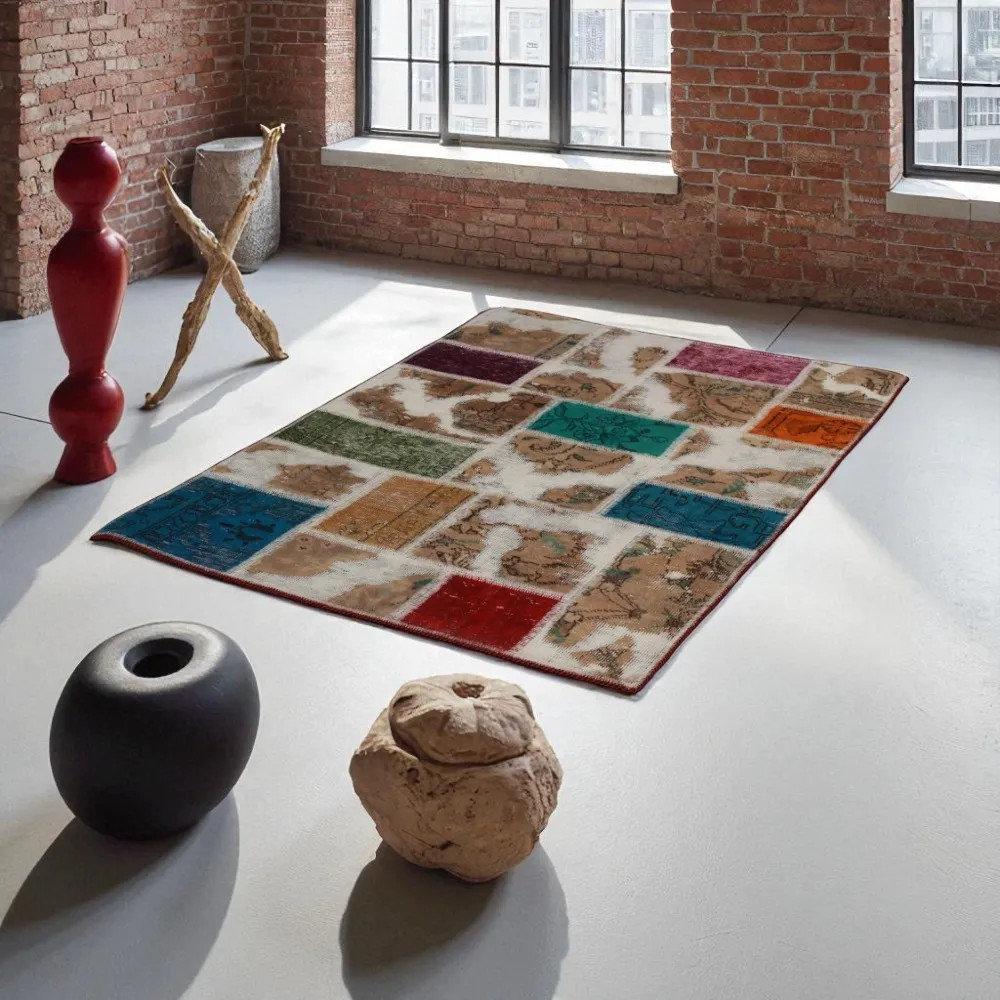 Les tapis design Patchwork sont principalement faits de tapis persans. Ils sont généralement assemblés à partir de tapis usagés âgés d'environ 30 à 35 ans. Ils passent par un processus spécial au cours duquel le tapis est entièrement poncé, teint et enfin découpé en différents morceaux. Les meilleurs morceaux sont combinés par des designers qualifiés pour créer les meilleurs tapis Design Patchwork possibles. Un tapis provenant de différentes époques s'assemble pour former un nouvel ensemble.