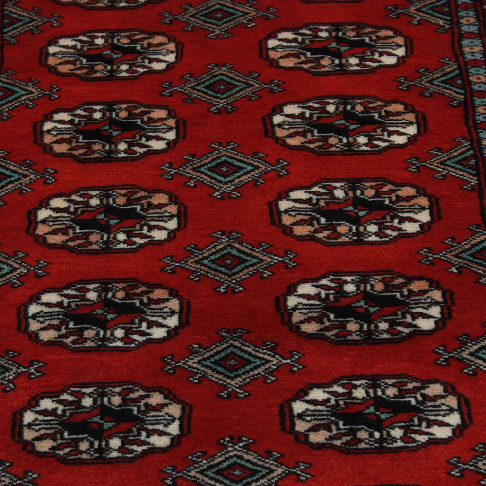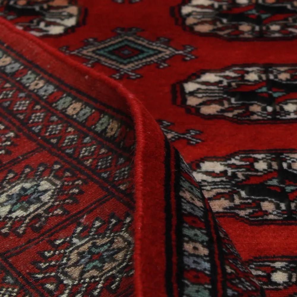 Le tapis pakistanais est fait dans les provinces du Pendjab et du Sindh. Reflet d'une tradition séculaire, ce tapis Oriental est un hommage au savoir-faire et à l'art des artisans. Les tapis pakistanais sont réputés dans le monde entier pour leur qualité et sont porteurs du riche héritage culturel du Pakistan. Les techniques de conception et de fabrication de ce tapis Oriental proviennent du peuple Turkmène, qui les échangeait sur le vieux marché aux tapis de la célèbre ville de Boukhara. L'un des motifs les plus célèbres (Boukhara) tire son nom de cette ville et constitue depuis lors l'une des caractéristiques de ces magnifiques tapis Oriental. Les tapis pakistanais sont faits de laine mérinos de Nouvelle-Zélande, ce qui leur confère une qualité et une durabilité exceptionnelles. Grâce à leur nouage dense, ils sont durables et résistants à l'usure et aux déchirures dues à l'usage quotidien. Cet élégant tapis est aujourd'hui considéré comme l'un des plus beaux tapis en laine du Pakistan. Après avoir été fait et tondu, le tapis est lavé quatre fois, puis soigneusement séché pour conserver ses couleurs éclatantes et sa solidité. Avec leurs motifs géométriques et leurs couleurs élégantes, ils ajoutent une ambiance unique à votre intérieur, qu'il s'agisse d'un tapis de salon pour rehausser l'élégance de la pièce ou d'un tapis de chambre à coucher qui ajoute confort et douceur à vos pas. Le tapis coureur pakistanais est également un choix idéal pour les couloirs. Si vous êtes à la recherche d'un tapis Oriental unique, fait de matériaux de qualité et témoignant d'un savoir-faire artistique, les tapis en laine pakistanais sont le choix idéal. La combinaison harmonieuse de motifs sophistiqués et de couleurs vives créera une atmosphère magique dans n'importe quelle pièce. Un tapis pakistanais n'est pas seulement esthétique, il est aussi extrêmement pratique. Sa surface densément nouée est durable et résistante, ce qui lui permet de rester en bon état pendant de nombreuses années. En outre, les propriétés naturelles de la laine lui permettent d'isoler le sol, ce qui lui confère d'excellentes propriétés d'isolation thermique. Les tapis pakistanais sont disponibles dans une large gamme de tailles et de formes, afin que chacun puisse trouver celui qui convient le mieux à sa maison.