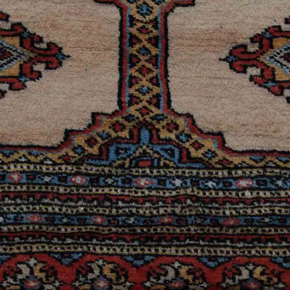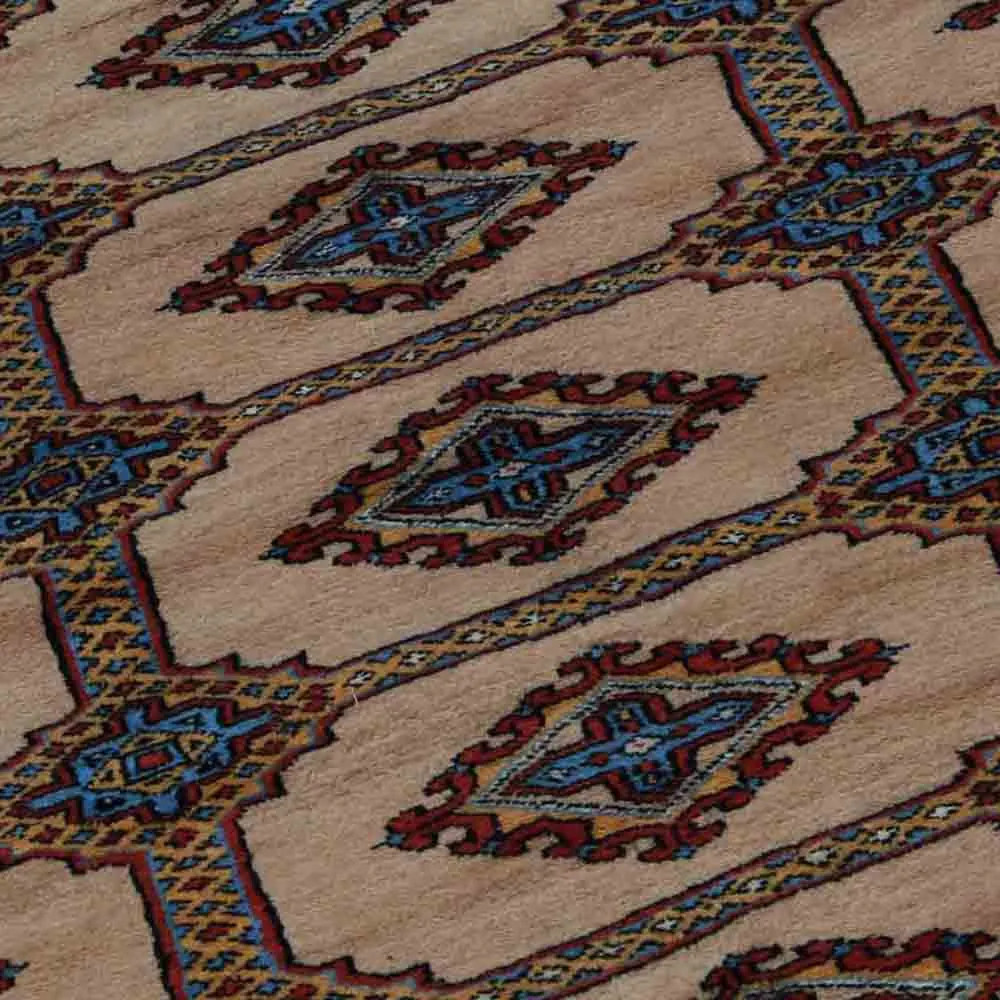 Le tapis pakistanais est fait dans les provinces du Pendjab et du Sindh. Reflet d'une tradition séculaire, ce tapis Oriental est un hommage au savoir-faire et à l'art des artisans. Les tapis pakistanais sont réputés dans le monde entier pour leur qualité et sont porteurs du riche héritage culturel du Pakistan. Les techniques de conception et de fabrication de ce tapis Oriental proviennent du peuple Turkmène, qui les échangeait sur le vieux marché aux tapis de la célèbre ville de Boukhara. L'un des motifs les plus célèbres (Boukhara) tire son nom de cette ville et constitue depuis lors l'une des caractéristiques de ces magnifiques tapis Oriental. Les tapis pakistanais sont faits de laine mérinos de Nouvelle-Zélande, ce qui leur confère une qualité et une durabilité exceptionnelles. Grâce à leur nouage dense, ils sont durables et résistants à l'usure et aux déchirures dues à l'usage quotidien. Cet élégant tapis est aujourd'hui considéré comme l'un des plus beaux tapis en laine du Pakistan. Après avoir été fait et tondu, le tapis est lavé quatre fois, puis soigneusement séché pour conserver ses couleurs éclatantes et sa solidité. Avec leurs motifs géométriques et leurs couleurs élégantes, ils ajoutent une ambiance unique à votre intérieur, qu'il s'agisse d'un tapis de salon pour rehausser l'élégance de la pièce ou d'un tapis de chambre à coucher qui ajoute confort et douceur à vos pas. Le tapis coureur pakistanais est également un choix idéal pour les couloirs. Si vous êtes à la recherche d'un tapis Oriental unique, fait de matériaux de qualité et témoignant d'un savoir-faire artistique, les tapis en laine pakistanais sont le choix idéal. La combinaison harmonieuse de motifs sophistiqués et de couleurs vives créera une atmosphère magique dans n'importe quelle pièce. Un tapis pakistanais n'est pas seulement esthétique, il est aussi extrêmement pratique. Sa surface densément nouée est durable et résistante, ce qui lui permet de rester en bon état pendant de nombreuses années. En outre, les propriétés naturelles de la laine lui permettent d'isoler le sol, ce qui lui confère d'excellentes propriétés d'isolation thermique. Les tapis pakistanais sont disponibles dans une large gamme de tailles et de formes, afin que chacun puisse trouver celui qui convient le mieux à sa maison.